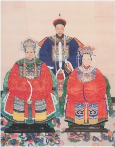 據《越城周氏支譜》記載,孫月仙“生道光癸巳九月十九日子時,卒同治甲子九月初五日亥時”[23],即生于1833年10月31日,卒于1864年10月5日。她于1858年生周德(周氏兄弟的大姑母),1860年生周伯宜(周氏兄弟的父親)[24]655;其間還生育過一個兒子,但夭折了[25]。她去世時僅有31歲,與幼年魏連殳眼中“年青,好看”的形象相符合。孫月仙畫像現(xiàn)藏紹興魯迅紀念館,這是一張周福清與孫氏、蔣氏的彩繪神像,縱167.8厘米,橫113.5厘米,20世紀50年代由周作人捐贈(見圖1)。由于有兩名子女長大成人,孫月仙在周氏家族中一直被紀念,周作人稱其為“先祖妣孫太君”,在日記中記載了周家在其生辰、忌日對她的祭祀。